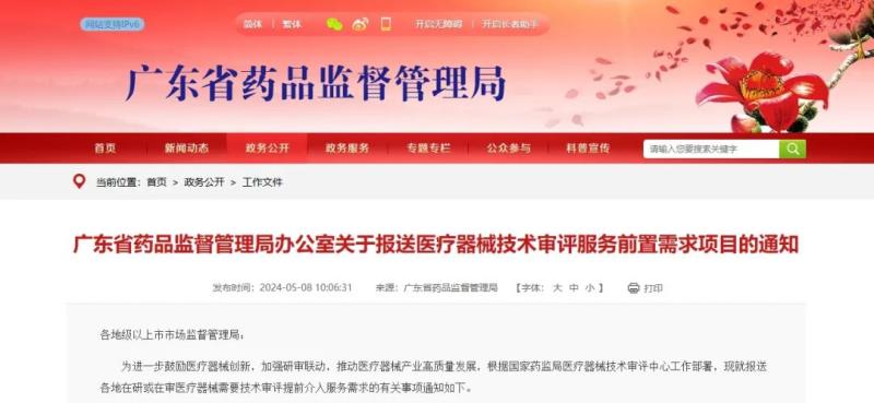 5月8日,廣東省藥監(jiān)局發(fā)布《關(guān)于報(bào)送醫(yī)療器械技術(shù)審評(píng)服務(wù)前置需求項(xiàng)目的通知》,以滿足重點(diǎn)項(xiàng)目及產(chǎn)品的技術(shù)審評(píng)提前介入服務(wù)需求,具體事項(xiàng)如下:
