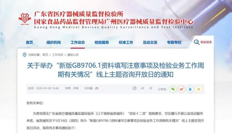 近日,廣東省醫(yī)療器械質(zhì)量監(jiān)督檢驗(yàn)所官網(wǎng)發(fā)布通知,定于5月16日(周四)舉辦“新版GB 9706.1資料填寫注意事項(xiàng)及檢驗(yàn)業(yè)務(wù)工作周期有關(guān)情況”線上主題咨詢開放日活動(dòng),具體時(shí)間及參會(huì)方式如下: