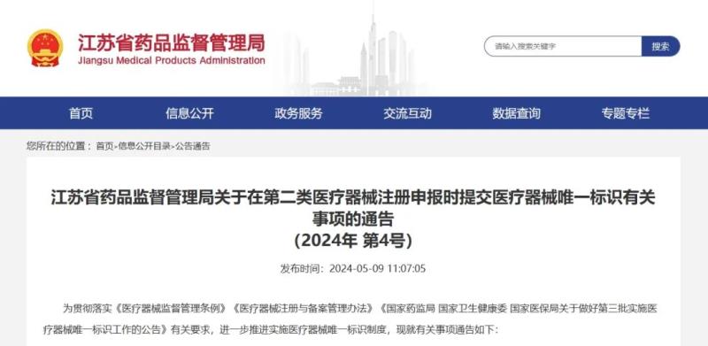 隨著第三批醫(yī)療器械唯一標(biāo)識(shí)實(shí)施日期的臨近,近日,江蘇省藥監(jiān)局發(fā)布《關(guān)于在第二類醫(yī)療器械注冊(cè)申報(bào)時(shí)提交醫(yī)療器械唯一標(biāo)識(shí)有關(guān)事項(xiàng)的通告(2024年 第4號(hào))》,具體如下: