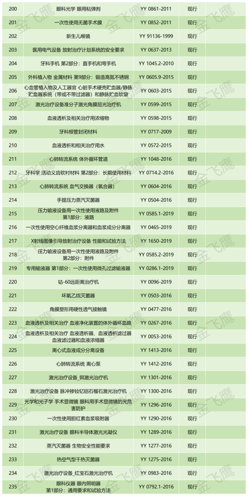 本期文章我們將中檢院官網(wǎng)公布的醫(yī)療器械強(qiáng)制性行業(yè)標(biāo)準(zhǔn)(即以YY作為編號(hào)開(kāi)頭的標(biāo)準(zhǔn))匯總到一起,共計(jì)有235項(xiàng)標(biāo)準(zhǔn)(包括192項(xiàng)現(xiàn)行標(biāo)準(zhǔn)及43項(xiàng)即將實(shí)施的標(biāo)準(zhǔn)),部分展示如下: