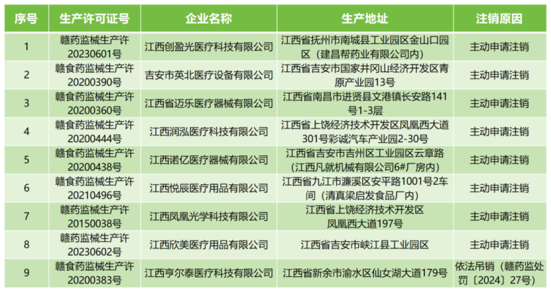 江西藥監(jiān)局:以下9家企業(yè)的醫(yī)療器械生產(chǎn)許可證已被注銷!