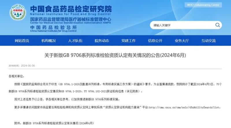 6月6日,中檢院官網(wǎng)公布了截至2024年6月3日,75個新版GB 9706系列標準檢驗資質(zhì)認定情況和GB 9706.1-2020、YY 9706.102-2021獲證機構(gòu)信息。