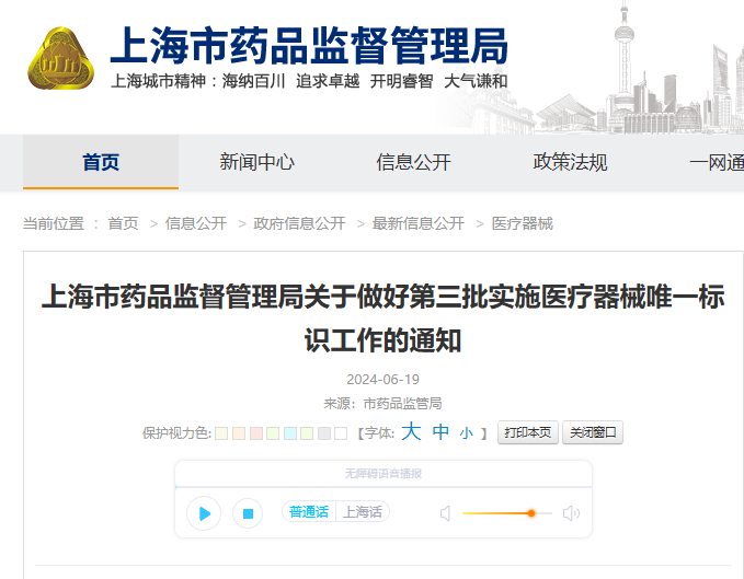 上海市藥品監(jiān)督管理局 - 2024年6月19日,發(fā)布通知提醒第三批UDI實(shí)施工作即將正式執(zhí)行-《上海市藥品監(jiān)督管理局關(guān)于做好第三批實(shí)施醫(yī)療器械唯一標(biāo)識(shí)工作的通知》