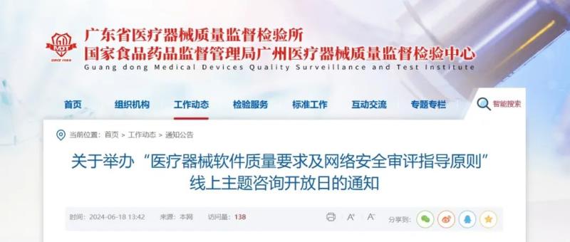 近日,廣東省醫(yī)療器械質(zhì)量監(jiān)督檢驗(yàn)所官網(wǎng)發(fā)布通知稱(chēng),該所定于7月1日(周一)舉辦“醫(yī)療器械軟件質(zhì)量要求及網(wǎng)絡(luò)安全審評(píng)指導(dǎo)原則”線上主題咨詢開(kāi)放日活動(dòng),具體內(nèi)容及參會(huì)方式如下: