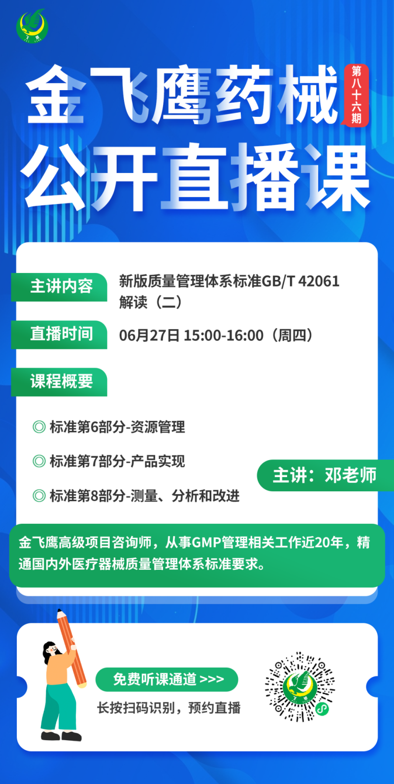 金飛鷹直播培訓(xùn),是每周一次的固定培訓(xùn)欄目,優(yōu)選金飛鷹國內(nèi)外資深注冊/項目老師定期為大家講解醫(yī)療器械注冊相關(guān)知識,解答大家在醫(yī)療器械注冊過程中的諸多疑問。