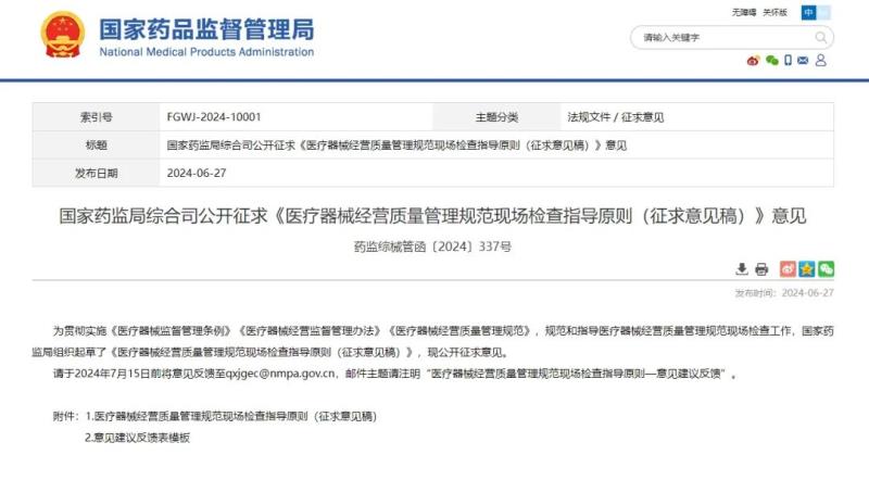 6月28日,國(guó)家藥監(jiān)局發(fā)布《醫(yī)療器械經(jīng)營(yíng)質(zhì)量管理規(guī)范現(xiàn)場(chǎng)檢查指導(dǎo)原則(征求意見稿)》(以下簡(jiǎn)稱《指導(dǎo)原則》),并向社會(huì)公開征求意見。
