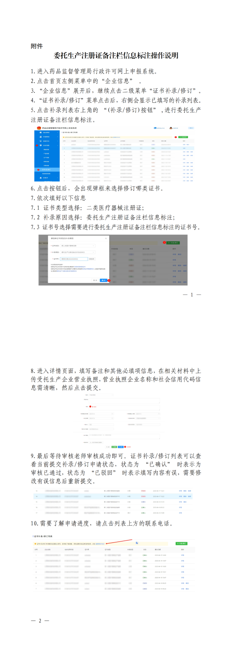 一、自2024年6月1日起,涉及境內(nèi)委托生產(chǎn)的注冊申請或者延續(xù)注冊申請,省局將在醫(yī)療器械注冊證生產(chǎn)地址欄中登載受托生產(chǎn)地址并注明“(委托生產(chǎn))”,同時在備注欄備注受托生產(chǎn)企業(yè)名稱和統(tǒng)一社會信用代碼,備注形式為“受托生產(chǎn)企業(yè):XXXX公司;統(tǒng)一社會信用代碼:XXXX”。變更注冊涉及注冊人委托生產(chǎn)的,也將在變更注冊文件中按照上述方式注明委托生產(chǎn)相關(guān)信息,并將變更信息在注冊證書生產(chǎn)地址和備注相應(yīng)字段中更新。 二、僅受托生產(chǎn)企業(yè)名稱文字性變化的,無需申請變更備案,在延續(xù)注冊時,核發(fā)修改后的注冊證。 三、對省內(nèi)已核發(fā)的涉及境內(nèi)委托生產(chǎn)的注冊證,若未按照上述要求標(biāo)注相關(guān)信息,注冊人可按照附件操作說明申請標(biāo)注,相關(guān)工作應(yīng)在8月31日前完成。 四、注冊人不再進(jìn)行委托生產(chǎn)的,應(yīng)當(dāng)及時向省局核減受托生產(chǎn)地址;受托生產(chǎn)企業(yè)應(yīng)當(dāng)及時向所在地省級藥品監(jiān)督管理部門報(bào)告有關(guān)情況。 五、注冊人在申請標(biāo)注過程中存在疑問的,可與省局相關(guān)部門聯(lián)系。醫(yī)療器械注冊管理處,0791-88158031;系統(tǒng)運(yùn)維工程師,0791-88125223(吳工)、0791-86507350(涂工)。