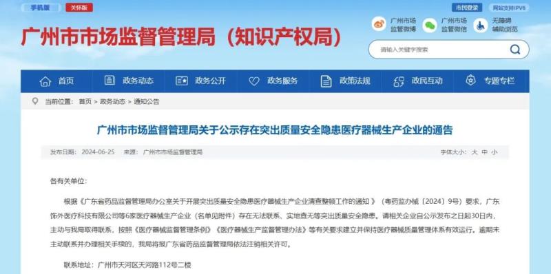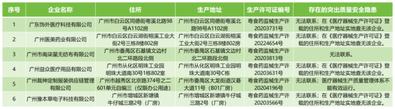 廣州市場監(jiān)管局:以下6家醫(yī)械生產(chǎn)企業(yè)存在突出質(zhì)量安全隱患