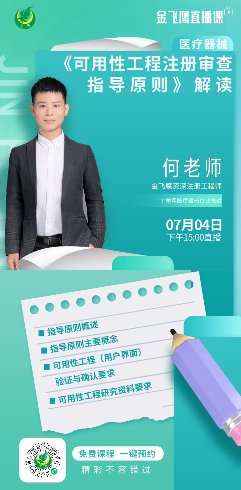 7月4日下午3點,金飛鷹資深注冊工程師,擁有十余年醫(yī)療器械行業(yè)經(jīng)驗,對可用性工程頗有研究的何老師,給大家?guī)怼夺t(yī)療器械可用性工程注冊審查指導原則》解讀,培訓內(nèi)容包括指導原則概述、指導原則主要概念、可用性工程(用戶界面)驗證與確認要求、可用性工程研究資料要求,大家千萬不要錯過了哦! 溫馨提醒:為防止錯過培訓時間,記得識別下方二維碼提前預約 ?