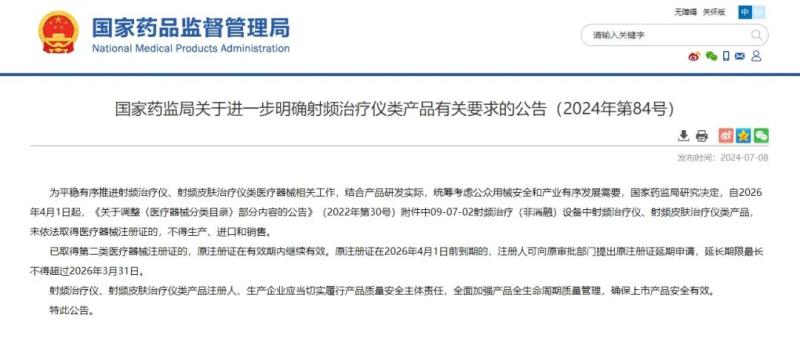7月8日,國(guó)家藥監(jiān)局發(fā)布《關(guān)于進(jìn)一步明確射頻治療儀類產(chǎn)品有關(guān)要求的公告(2024年第84號(hào))》,具體內(nèi)容如下: