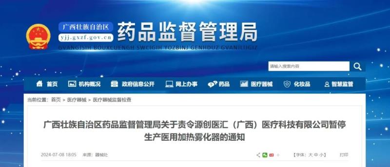 近日,廣西壯族自治區(qū)藥監(jiān)局發(fā)布《關(guān)于責(zé)令源創(chuàng)醫(yī)匯(廣西)醫(yī)療科技有限公司暫停生產(chǎn)醫(yī)用加熱霧化器的通知》,其中提到,該局于2024年6月28-30日組織檢查組對源創(chuàng)醫(yī)匯(廣西)醫(yī)療科技有限公司進(jìn)行飛行檢查,發(fā)現(xiàn)該企業(yè)質(zhì)量管理體系主要存在以下缺陷: