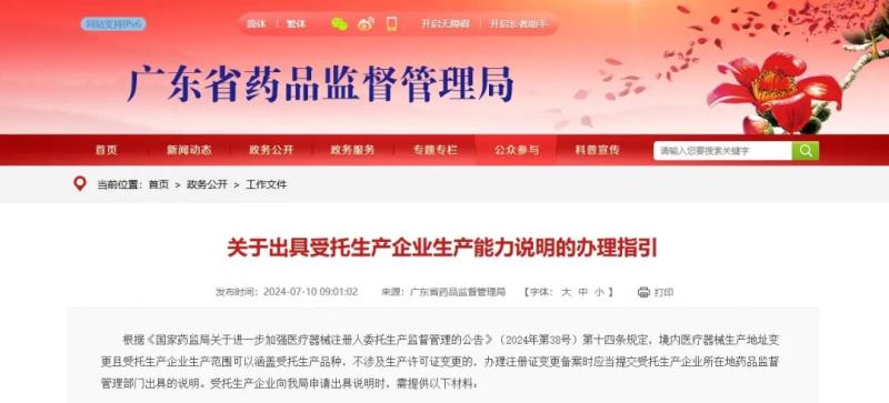 7月10日,廣東省藥監(jiān)局發(fā)布《關于出具受托生產企業(yè)生產能力說明的辦理指引》,其中提到,根據(jù)《國家藥監(jiān)局關于進一步加強醫(yī)療器械注冊人委托生產監(jiān)督管理的公告》(2024年第38號)第十四條規(guī)定,境內醫(yī)療器械生產地址變更且受托生產企業(yè)生產范圍可以涵蓋受托生產品種,不涉及生產許可證變更的,辦理注冊證變更備案時應當提交受托生產企業(yè)所在地藥品監(jiān)督管理部門出具的說明。