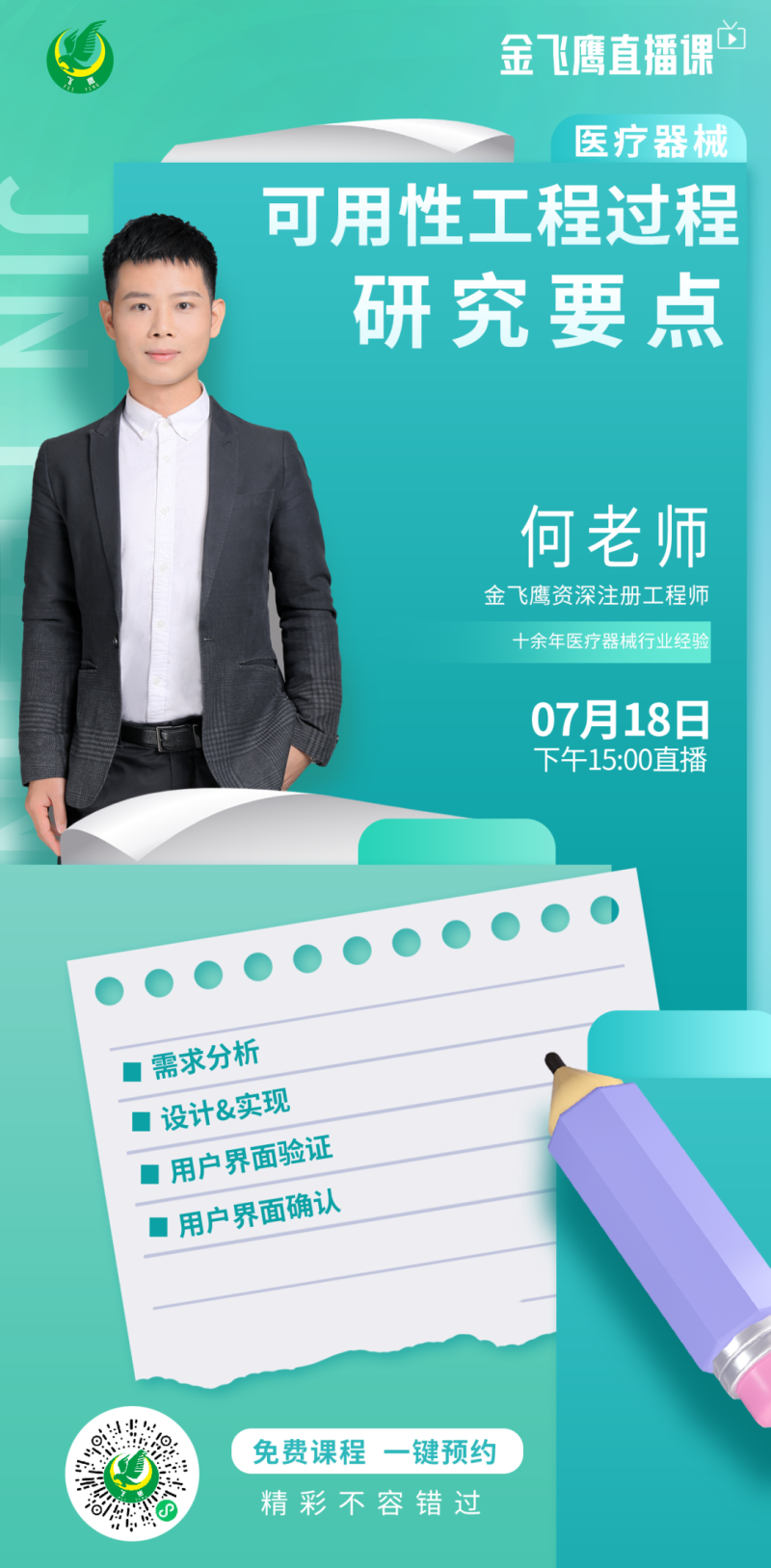 7月18日下午3點,金飛鷹資深注冊工程師,擁有十余年醫(yī)療器械行業(yè)經(jīng)驗,對可用性工程頗有研究的何老師繼續(xù)給大家?guī)怼夺t(yī)療器械可用性工程過程研究要點,培訓(xùn)內(nèi)容包括需求分析、設(shè)計&實現(xiàn)、用戶界面驗證、用戶界面確認大家千萬不要錯過了哦!