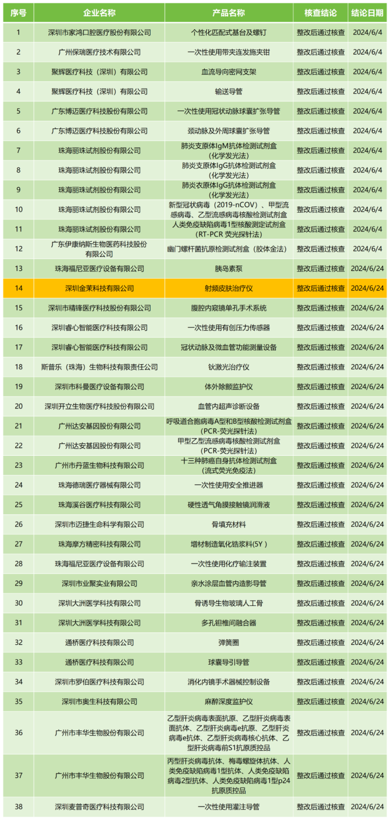 7月16日,廣東省藥監(jiān)局官網(wǎng)公布2024年6月醫(yī)療器械注冊質(zhì)量管理體系核查結(jié)果,包括深圳市家鴻口腔醫(yī)療股份有限公司的個性化匹配式基臺及螺釘、珠海福尼亞醫(yī)療設(shè)備有限公司的胰島素泵、深圳金茉科技有限公司的射頻皮膚治療儀共計38款產(chǎn)品,均為“整改后通過核查”。具體明細見下方表格: