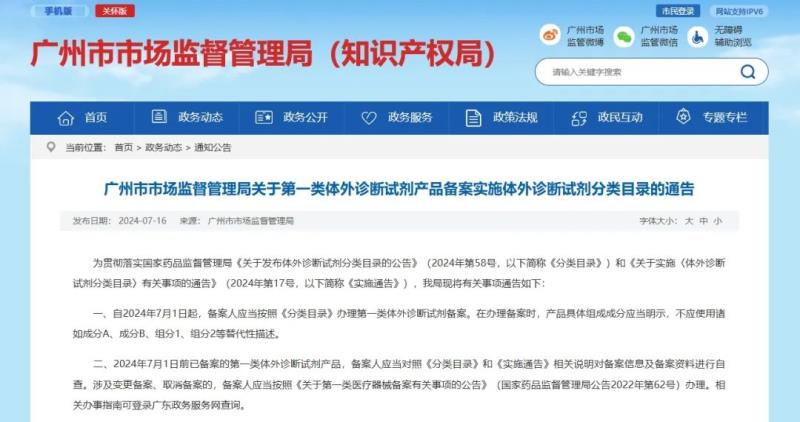 7月16日,廣州市市場監(jiān)督管理局發(fā)布《關(guān)于第一類體外診斷試劑產(chǎn)品備案實施體外診斷試劑分類目錄的通告》,其中提到,為貫徹落實國家藥品監(jiān)督管理局《關(guān)于發(fā)布體外診斷試劑分類目錄的公告》(2024年第58號,以下簡稱《分類目錄》)和《關(guān)于實施〈體外診斷試劑分類目錄〉有關(guān)事項的通告》(2024年第17號,以下簡稱《實施通告》),現(xiàn)將有關(guān)第一類體外診斷試劑備案的有關(guān)事項通告如下: