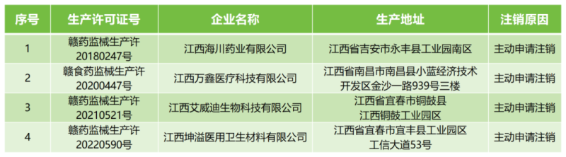 7月17日,江西省藥監(jiān)局發(fā)布公告稱,該局已依法注銷江西海川藥業(yè)有限公司、江西萬(wàn)鑫醫(yī)療科技有限公司等4家企業(yè)的《醫(yī)療器械生產(chǎn)許可證》,注銷原因均為“企業(yè)主動(dòng)申請(qǐng)注銷,具體明細(xì)如下:
