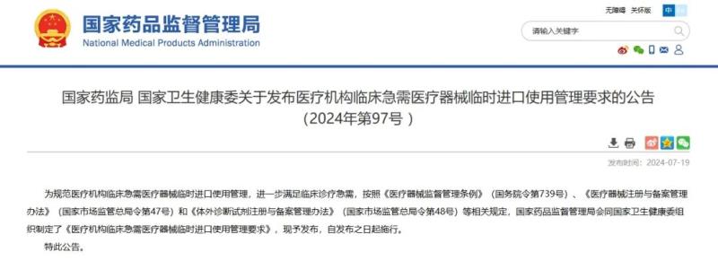 7月19日,國(guó)家藥監(jiān)局《醫(yī)療機(jī)構(gòu)臨床急需醫(yī)療器械臨時(shí)進(jìn)口使用管理要求》(以下簡(jiǎn)稱(chēng)《管理要求》),并宣布自發(fā)布之日起施行。