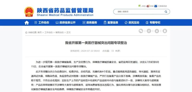 7月22日,陜西省藥監(jiān)局發(fā)布通知稱,該局決定從7月初至8月15日,在全省開展第一類醫(yī)療器械突出問題專項整治。此次專項整治共分為自查自糾、檢查評估、總結鞏固、完善機制4個階段。重點圍繞醫(yī)用退熱凝膠、導光凝膠、測序反應通用試劑盒、細胞染色液、免疫顯色試劑等第一類醫(yī)療器械產(chǎn)品,嚴厲打擊備案產(chǎn)品分類不準確,涉嫌高類低備;備案產(chǎn)品名稱不規(guī)范,不符合命名規(guī)則;實際生產(chǎn)上市的產(chǎn)品標簽外包裝和產(chǎn)品說明書內(nèi)容與備案資料不一致,涉嫌夸大宣傳與虛假宣傳;產(chǎn)品在網(wǎng)絡銷售環(huán)節(jié)涉嫌夸大宣傳與虛假宣傳,誤導消費者等違法違規(guī)行為,強化系統(tǒng)治理與依法整治相結合,有效排查化解醫(yī)療器械質(zhì)量安全風險隱患,保障醫(yī)療器械安全形勢穩(wěn)定向好。陜西省藥監(jiān)局要求,各級監(jiān)管部門要加強領導、細化分工、通力協(xié)作,夯實屬地監(jiān)管責任,加強新備案產(chǎn)品的資料審核,及時公布備案產(chǎn)品信息,堅決杜絕高類低備、非醫(yī)療器械作為醫(yī)療器械備案、備案說明書與備案基本信息不一致等問題。要堅持全面清理、重點清理、動態(tài)清理相結合,強化監(jiān)督檢查,加強問題產(chǎn)品處置,發(fā)現(xiàn)違法違規(guī)行為依法立即采取風險防控措施,查辦一批違法案件、曝光一批典型案例,清理一批違法機構、懲處一批害群之馬,始終保持嚴打高壓態(tài)勢。要強化風險研判,建立問題處置清單,明確責任單位和責任人,及時消除第一類醫(yī)療器械全鏈條監(jiān)管風險。