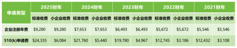 接下來,我們將近幾年來的企業(yè)注冊年費和510(k)申請費匯總至下方表格,從表格可以看出,這兩項費用每年都有上漲,其中510(k)申請費(標(biāo)準(zhǔn)收費)從2021財年的$12432到2025財年的$24335,漲幅接近100%: