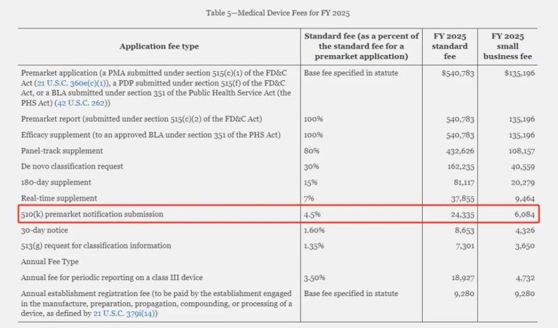 具體來說,企業(yè)注冊年費漲至$9280,相比2023財年的$7653上漲了$1627,漲幅21.2%;510(k)申請費(標(biāo)準(zhǔn)收費)漲至$24335,相比2023財年的$21760上漲了$2575,漲幅11.8%。當(dāng)然,如果申請了小企業(yè)資質(zhì),企業(yè)的510(k)申請費是會便宜很多的,2025財年是6084美元(2024財年則是5440美元)。