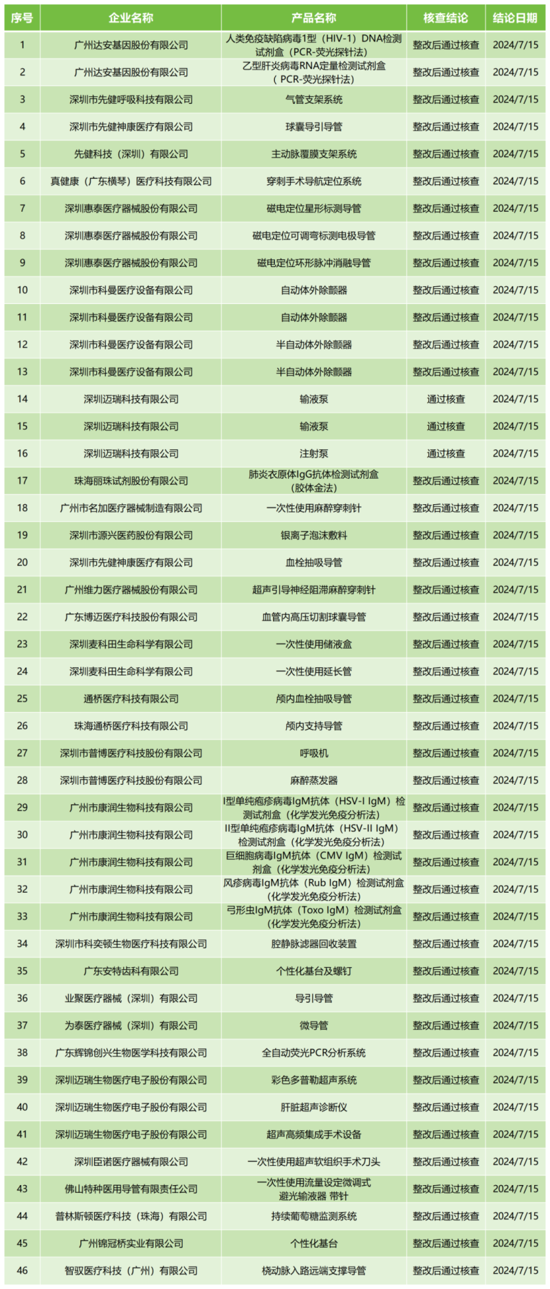 8月6日,廣東省藥監(jiān)局官網(wǎng)公布2024年7月醫(yī)療器械注冊(cè)質(zhì)量管理體系核查結(jié)果,包括深圳市科曼醫(yī)療設(shè)備有限公司的自動(dòng)體外除顫器、深圳邁瑞科技有限公司的輸液泵、深圳市源興醫(yī)藥股份有限公司的銀離子泡沫敷料等共計(jì)46款產(chǎn)品,其中深圳邁瑞科技有限公司的3款產(chǎn)品為“通過核查”,其余均為“整改后通過核查”。具體明細(xì)見下方表格: