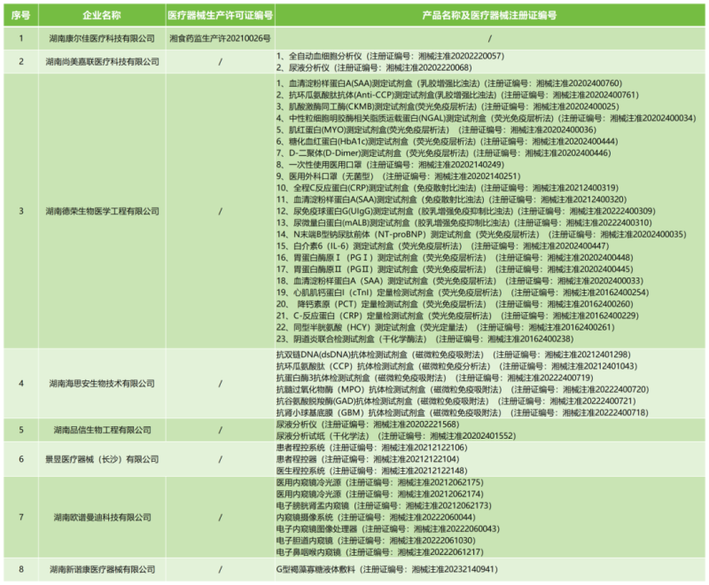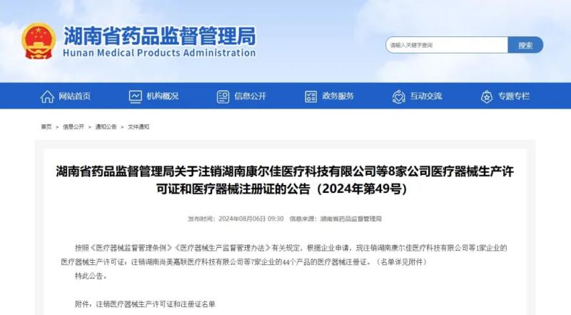 8月6日,湖南省藥監(jiān)局發(fā)布公告稱,按照《醫(yī)療器械監(jiān)督管理條例》《醫(yī)療器械生產(chǎn)監(jiān)督管理辦法》有關(guān)規(guī)定,根據(jù)企業(yè)申請,現(xiàn)注銷湖南康爾佳醫(yī)療科技有限公司等1家企業(yè)的醫(yī)療器械生產(chǎn)許可證;注銷湖南尚美嘉聯(lián)醫(yī)療科技有限公司等7家企業(yè)44個產(chǎn)品的醫(yī)療器械注冊證,具體明細如下: