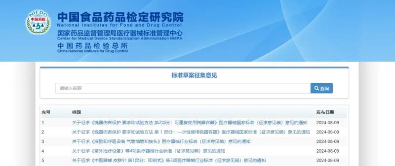 8月9日,國(guó)家藥監(jiān)局醫(yī)療器械標(biāo)準(zhǔn)管理中心發(fā)布幾則關(guān)于征求醫(yī)療器械行業(yè)標(biāo)準(zhǔn)意見(jiàn)的通知,通知顯示,近期共有10項(xiàng)標(biāo)準(zhǔn)形成了征求意見(jiàn)稿,具體明細(xì)如下: