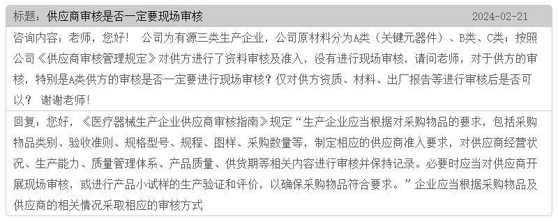 有源醫(yī)療器械產(chǎn)品生產(chǎn)可能會(huì)需要用到不同種類(lèi)的原材料,按照采購(gòu)物料分級(jí)可分為A類(lèi)(關(guān)鍵元器件)、B類(lèi)、C類(lèi),那么生產(chǎn)企業(yè)對(duì)于A類(lèi)關(guān)鍵原材料供應(yīng)商的審核,是否一定要進(jìn)行現(xiàn)場(chǎng)審核呢??jī)H對(duì)其資質(zhì)、材料、出廠報(bào)告等進(jìn)行審核是否可行?