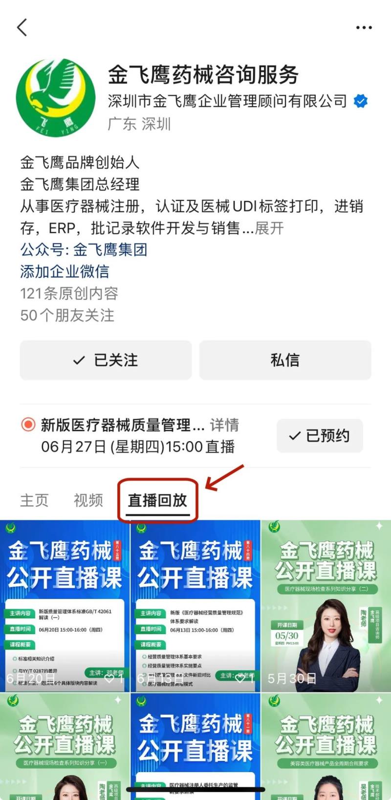 往期直播培訓課程支持回放,關(guān)注“金飛鷹藥械咨詢服務(wù)”視頻號并點擊視頻號主頁,即可查看“直播回放”哦~