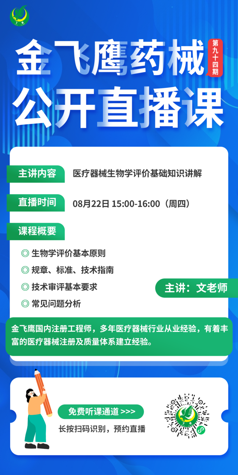 8月22日下午3點,金飛鷹國內(nèi)注冊工程師,有著豐富的醫(yī)療器械注冊及質(zhì)量體系建立經(jīng)驗的文老師,給大家?guī)怼夺t(yī)療器械生物學評價基礎(chǔ)知識講解》,培訓內(nèi)容包括生物學評價基本原則、規(guī)章/標準/技術(shù)指南、技術(shù)審評基本要求、常見問題分析,大家千萬不要錯過了!