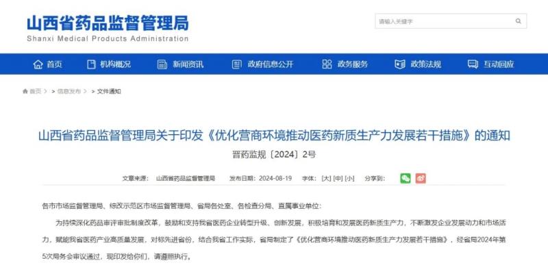 8月19日,山西省藥監(jiān)局發(fā)布《優(yōu)化營(yíng)商環(huán)境推動(dòng)醫(yī)藥新質(zhì)生產(chǎn)力發(fā)展若干措施》(以下簡(jiǎn)稱(chēng)《若干措施》),并宣布自2024年8月1日起施行,有效期至2029年7月31日。