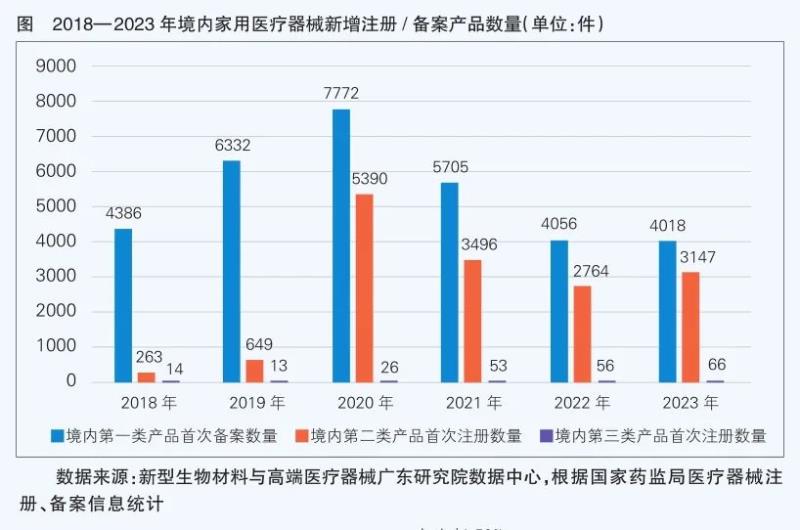 本文轉(zhuǎn)載自中國醫(yī)藥報(bào) 作者:張梓敏?況宇迪?郝麗靜 隨著心血管疾病、糖尿病等慢性疾病患病率上升和人口老齡化發(fā)展,慢性疾病監(jiān)控和日常健康管理需求不斷增加;監(jiān)測與診療場景也逐步從醫(yī)院端延伸向家庭端,帶動(dòng)了家用醫(yī)療器械市場的快速發(fā)展。此外,即時(shí)檢測(POCT)與智能化技術(shù)的發(fā)展也不斷推動(dòng)傳統(tǒng)家用醫(yī)療器械升級創(chuàng)新。目前,我國家用醫(yī)療器械市場呈現(xiàn)產(chǎn)業(yè)集聚、產(chǎn)品多元的發(fā)展態(tài)勢。 國產(chǎn)產(chǎn)品居多 以第一類和第二類醫(yī)療器械為主 根據(jù)美國食品藥品管理局(FDA)指導(dǎo)文件的定義,家用醫(yī)療器械主要是指標(biāo)明為在專業(yè)醫(yī)療場所之外的任何環(huán)境中使用的醫(yī)療器械?;谏鲜龆x和2023年國家藥監(jiān)局發(fā)布的新版《醫(yī)療器械分類目錄》,家用醫(yī)療器械在我國涉及“醫(yī)用診察和監(jiān)護(hù)器械”“呼吸、麻醉和急救器械”“物理治療器械”“注輸、護(hù)理和防護(hù)器械”“患者承載器械”“眼科器械”“婦產(chǎn)科、輔助生殖和避孕器械”“醫(yī)用康復(fù)器械”“中醫(yī)器械”“臨床檢驗(yàn)器械”“體外診斷試劑”11個(gè)產(chǎn)品大類。 按照使用功能分類,家用醫(yī)療器械可分為治療類,如遠(yuǎn)紅外線治療儀、磁療儀、理療儀、中頻治療儀等;檢測類,如血壓檢測儀、血糖檢測儀、電子體溫計(jì)、聽診器等;康復(fù)類,如家用制氧機(jī)、頸椎腰椎牽引器、矯形器等。 根據(jù)國家藥監(jiān)局醫(yī)療器械注冊、備案信息統(tǒng)計(jì)(下同)顯示,截至今年7月,我國已注冊/備案家用醫(yī)療器械產(chǎn)品共計(jì)66336件,其中進(jìn)口產(chǎn)品1605件、國產(chǎn)產(chǎn)品64731件。從產(chǎn)品分類上看,第三類醫(yī)療器械1168件、第二類醫(yī)療器械22602件、第一類醫(yī)療器械42566件;涉及的11類醫(yī)療器械分類目錄產(chǎn)品中,最多的是注輸、護(hù)理和防護(hù)器械,共計(jì)29795件,占比44.92%;其次是物理治療器械、醫(yī)用康復(fù)器械,分別為18885件(28.47%)、7709件(11.62%)。從使用功能方面看,主要為康復(fù)類器械及治療類器械。 統(tǒng)計(jì)數(shù)據(jù)顯示,境內(nèi)家用醫(yī)療器械新增注冊及備案數(shù)量在2019年和2020年均有較大提升,2021年開始有所回落,2023年相較于2022年又出現(xiàn)小幅增長。其中,2020年受新冠疫情影響,家用醫(yī)療器械產(chǎn)品需求快速增長,境內(nèi)第二類家用醫(yī)療器械產(chǎn)品首次注冊數(shù)量大幅增長,達(dá)到5390件,同比增長730.5%。(詳見圖)
