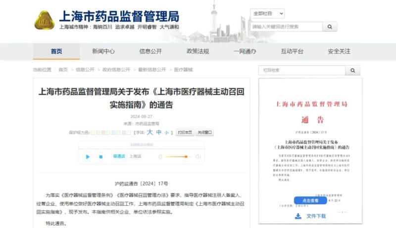 8月27日,上海市藥監(jiān)局發(fā)布《上海市醫(yī)療器械主動(dòng)召回實(shí)施指南》(以下簡(jiǎn)稱(chēng)《實(shí)施指南》),以指導(dǎo)醫(yī)療器械注冊(cè)人備案人、經(jīng)營(yíng)企業(yè)、使用單位做好醫(yī)療器械主動(dòng)召回工作。