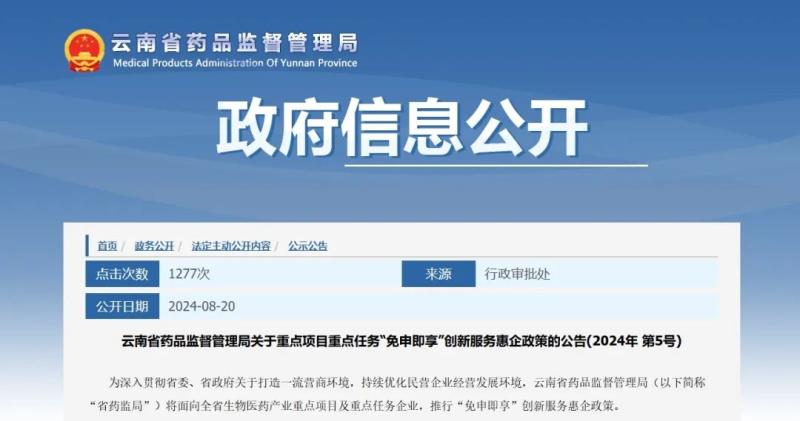 近日,云南省藥監(jiān)局發(fā)布公告稱,為深入貫徹省委、省政府關(guān)于打造一流營商環(huán)境,持續(xù)優(yōu)化民營企業(yè)經(jīng)營發(fā)展環(huán)境,該局將面向全省生物醫(yī)藥產(chǎn)業(yè)重點項目及重點任務(wù)企業(yè),推行“免申即享”創(chuàng)新服務(wù)惠企政策。具體如下: