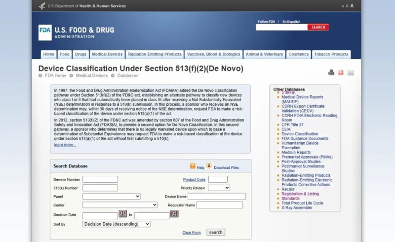 De Novo類似于國內(nèi)的分類界定,當(dāng)產(chǎn)品既不符合現(xiàn)有分類規(guī)則,也沒有已上市的同品種產(chǎn)品,可以申請(qǐng)De Novo。該數(shù)據(jù)庫可以查詢到以De Novo方式申請(qǐng)?jiān)?/span>美國上市的醫(yī)療器械產(chǎn)品。