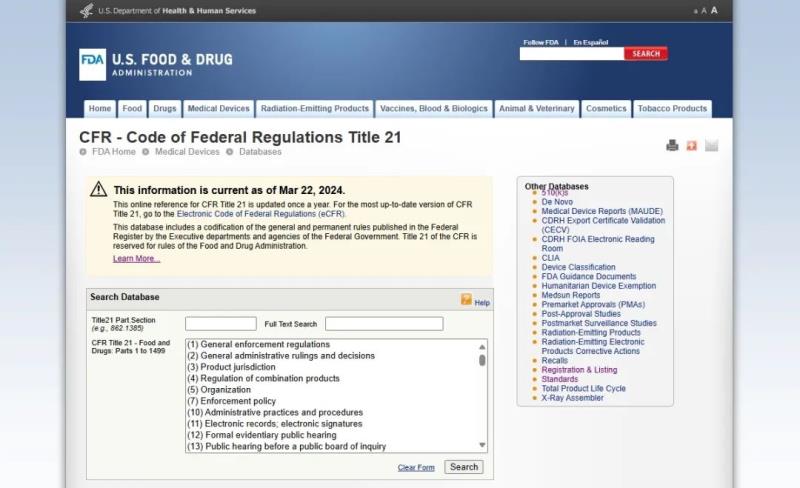 該數(shù)據(jù)庫能夠提供FDA監(jiān)管范圍內(nèi)產(chǎn)品相關(guān)的所有法規(guī)在線瀏覽,醫(yī)療器械相關(guān)的法規(guī)在第800-898章節(jié)(21 CFR part 800-898),用戶可以隨時(shí)檢索醫(yī)療器械相關(guān)法規(guī)。當(dāng)然,如該頁內(nèi)容所述,這里的法規(guī)內(nèi)容是一年更新一次的,假如需要獲取最新法規(guī),可跳轉(zhuǎn)至實(shí)時(shí)更新的CFR電子版