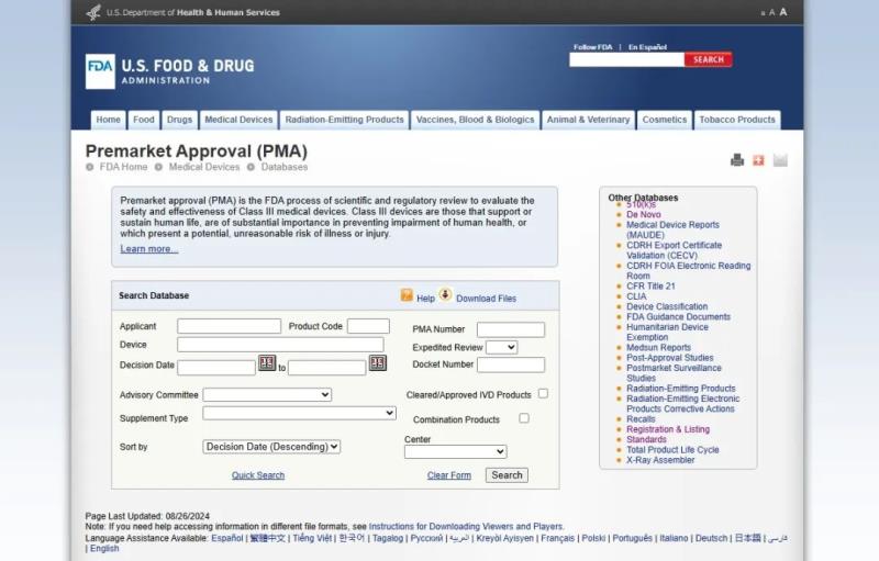 該數(shù)據(jù)庫包含所有通過PMA路徑在美國上市的高風(fēng)險(xiǎn)醫(yī)療器械的信息。