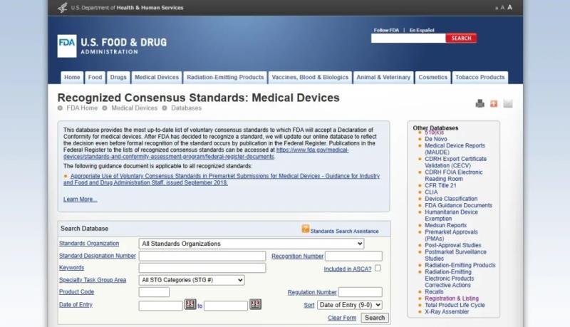 該數(shù)據(jù)庫包含了所有FDA認(rèn)可的協(xié)調(diào)標(biāo)準(zhǔn),可以通過標(biāo)準(zhǔn)組織、標(biāo)準(zhǔn)編號(hào)、關(guān)鍵詞等信息進(jìn)行檢索。