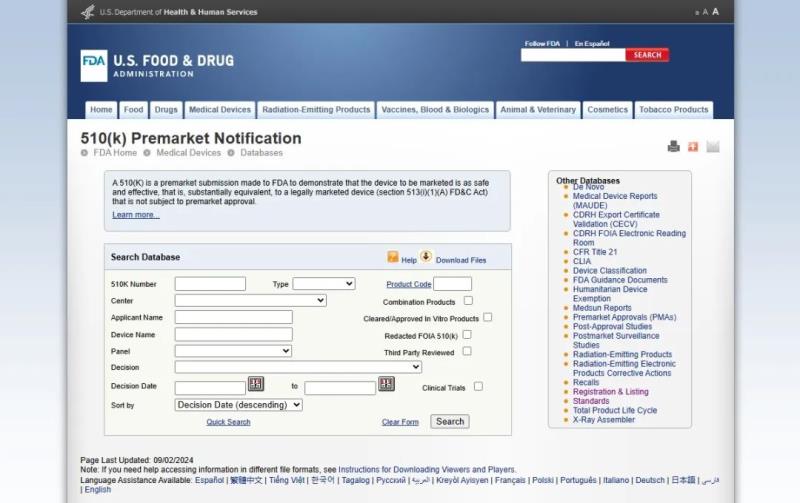 該數(shù)據(jù)庫包含所有通過510(k)路徑在美國上市的醫(yī)療器械信息。值得注意的是,該網(wǎng)址有一個(gè)最近更新日期,部分剛拿到510(k)號(hào)的產(chǎn)品可能查詢不到,等FDA官網(wǎng)信息更新后即可查詢。