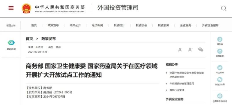 9月8日,商務(wù)部、國家衛(wèi)生健康委、國家藥監(jiān)局聯(lián)合發(fā)布《關(guān)于在醫(yī)療領(lǐng)域開展擴(kuò)大開放試點(diǎn)工作的通知》,以擴(kuò)大開放促進(jìn)我國醫(yī)療相關(guān)領(lǐng)域高質(zhì)量發(fā)展,更好滿足人民群眾醫(yī)療健康需求。以下為該通知具體內(nèi)容:
