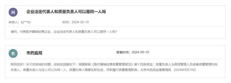 根據(jù)北京市藥監(jiān)局的答復(fù),新版《醫(yī)療器械經(jīng)營(yíng)質(zhì)量管理規(guī)范》第十四條規(guī)定:質(zhì)量負(fù)責(zé)人為高層管理人員或者質(zhì)量管理機(jī)構(gòu)負(fù)責(zé)人。質(zhì)量負(fù)責(zé)人與法人可以同一人,質(zhì)量負(fù)責(zé)人需要在職在崗,盡職履行質(zhì)量管理職責(zé)。