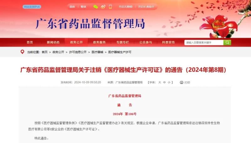 10月9日,廣東藥監(jiān)局發(fā)布通告稱,按照《醫(yī)療器械監(jiān)督管理?xiàng)l例》《醫(yī)療器械生產(chǎn)監(jiān)督管理辦法》有關(guān)規(guī)定,根據(jù)企業(yè)申請,該局已于依法注銷深圳傳世生物醫(yī)療有限公司、惠州市創(chuàng)榮發(fā)實(shí)業(yè)有限公司、深圳市愛蒂醫(yī)療電子有限責(zé)任公司等8家企業(yè)的《醫(yī)療器械生產(chǎn)許可證》,具體明細(xì)如下:
