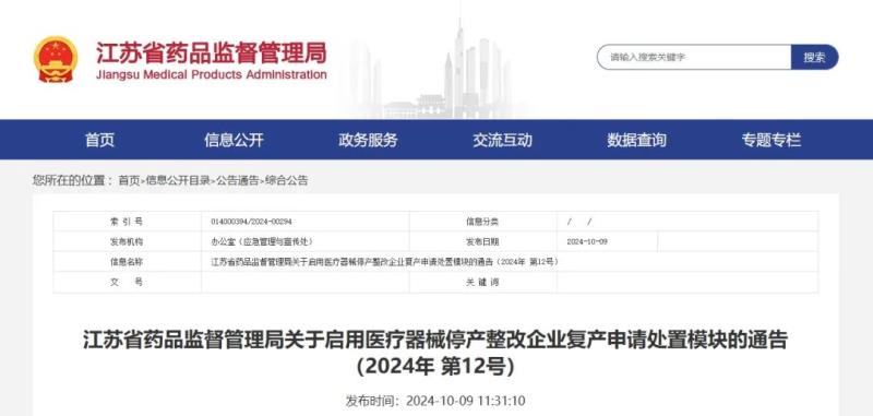 近日,江蘇省藥監(jiān)局發(fā)布《關于啟用醫(yī)療器械停產整改企業(yè)復產申請?zhí)幹媚K的通告》,其中提到,自2024年10月15日起,江蘇省藥品監(jiān)督管理局決定啟用醫(yī)療器械停產整改企業(yè)復產申請?zhí)幹媚K。具體通告內容如下: