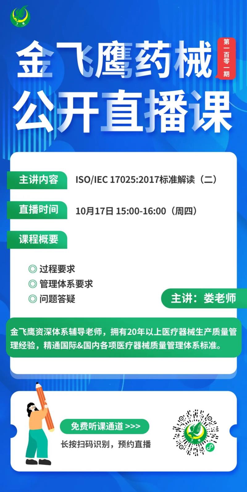 金飛鷹直播培訓(xùn)簡介 金飛鷹直播培訓(xùn),是每周一次的固定培訓(xùn)欄目,優(yōu)選金飛鷹國內(nèi)外資深注冊/項目老師定期為大家講解醫(yī)療器械注冊相關(guān)知識,解答大家在醫(yī)療器械注冊過程中的諸多疑問。 此前我們已為大家?guī)硇掳驷t(yī)療器械生物學(xué)評價標(biāo)準(zhǔn)、新版醫(yī)療器械風(fēng)險管理標(biāo)準(zhǔn)、醫(yī)療器械軟件注冊、新版醫(yī)療器械經(jīng)營質(zhì)量管理規(guī)范等共計100次線上培訓(xùn)課程,有興趣的可點(diǎn)擊視頻號直播回放進(jìn)行查看~另外大家也一定很關(guān)注接下來的培訓(xùn)主題,相關(guān)培訓(xùn)預(yù)告我們會陸續(xù)添加至視頻號,請大家持續(xù)關(guān)注哦!