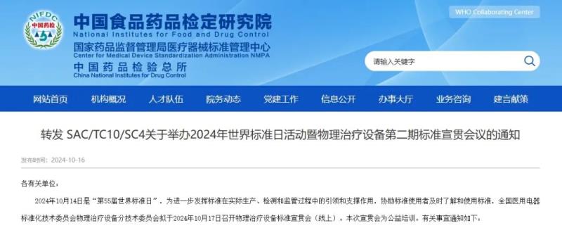 10月16日,中檢院官網(wǎng)轉(zhuǎn)發(fā)了一則標(biāo)準(zhǔn)宣貫會(huì)議通知,其中提到,全國(guó)醫(yī)用電器標(biāo)準(zhǔn)化技術(shù)委員會(huì)物理治療設(shè)備分技術(shù)委員會(huì)定于10月17日(周四)召開(kāi)物理治療設(shè)備標(biāo)準(zhǔn)宣貫會(huì)(線上),具體宣貫內(nèi)容、時(shí)間及參會(huì)方式如下: