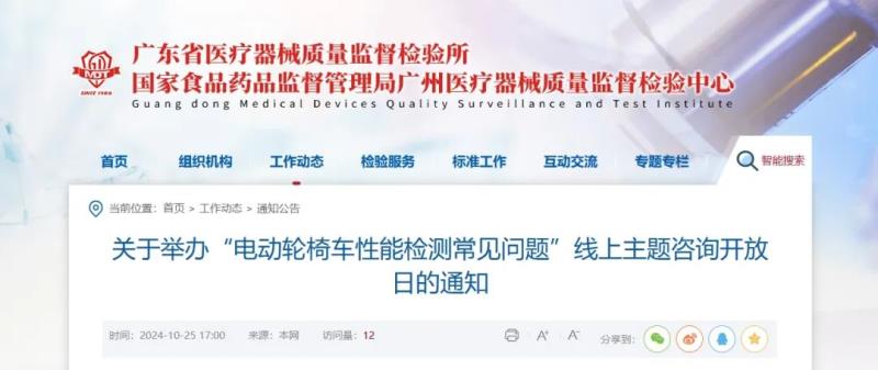近日,廣東省醫(yī)療器械質量監(jiān)督檢驗所官網發(fā)布通知,定于10月31日(周四)舉辦“電動輪椅車性能檢測常見問題”線上主題咨詢開放日活動,具體時間及參會方式如下: