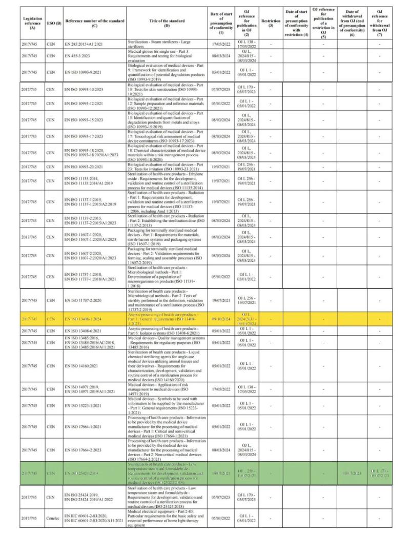 截至目前,歐盟MDR協(xié)調標準清單共計26項協(xié)調標準,具體見下方圖片(其中標黃的為本次更新標準,標綠的則為已經撤銷的標準):