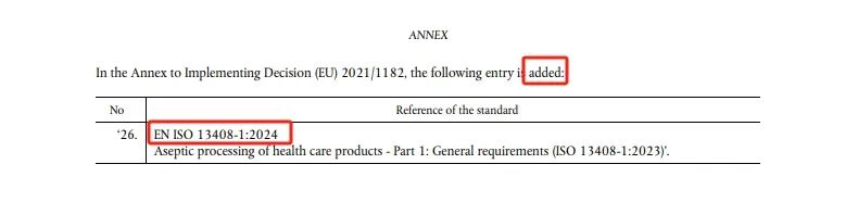 近日,歐盟官方日報發(fā)布了EU 2024/2631:關于修訂(EU) 2021/1182號實施決定中有關保健品無菌加工的協(xié)調標準內容。該標準的實施日期為2024年10月9日。