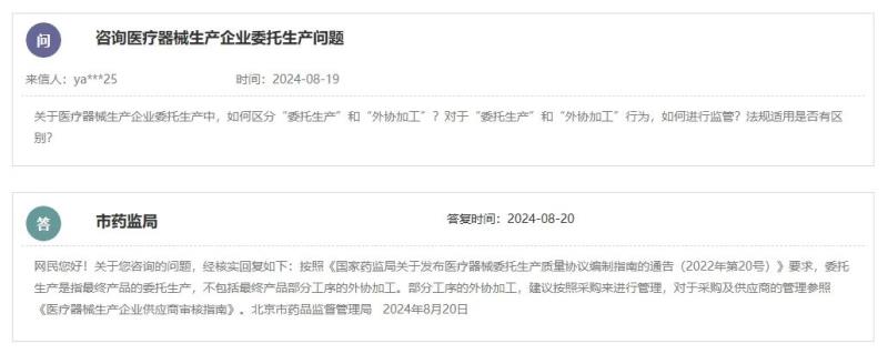 根據(jù)北京市藥監(jiān)局的答復,按照《國家藥監(jiān)局關(guān)于發(fā)布醫(yī)療器械委托生產(chǎn)質(zhì)量協(xié)議編制指南的通告(2022年第20號)》要求,委托生產(chǎn)是指最終產(chǎn)品的委托生產(chǎn),不包括最終產(chǎn)品部分工序的外協(xié)加工。部分工序的外協(xié)加工,建議按照采購來進行管理,對于采購及供應商的管理參照《醫(yī)療器械生產(chǎn)企業(yè)供應商審核指南》。