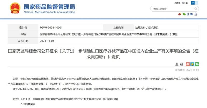 11月4日,國家藥監(jiān)局發(fā)布《關(guān)于進(jìn)一步明確進(jìn)口醫(yī)療器械產(chǎn)品在中國境內(nèi)企業(yè)生產(chǎn)有關(guān)事項(xiàng)的公告(征求意見稿)》(以下簡稱《公告》),并向社會(huì)公開征求意見。